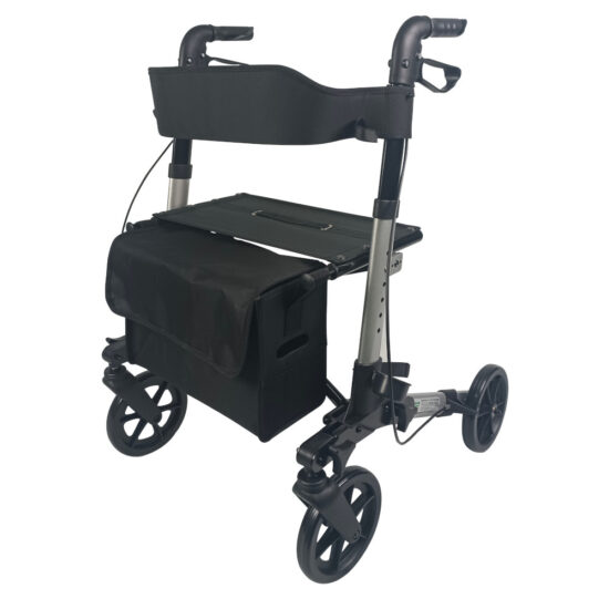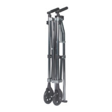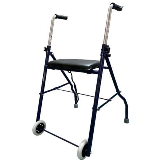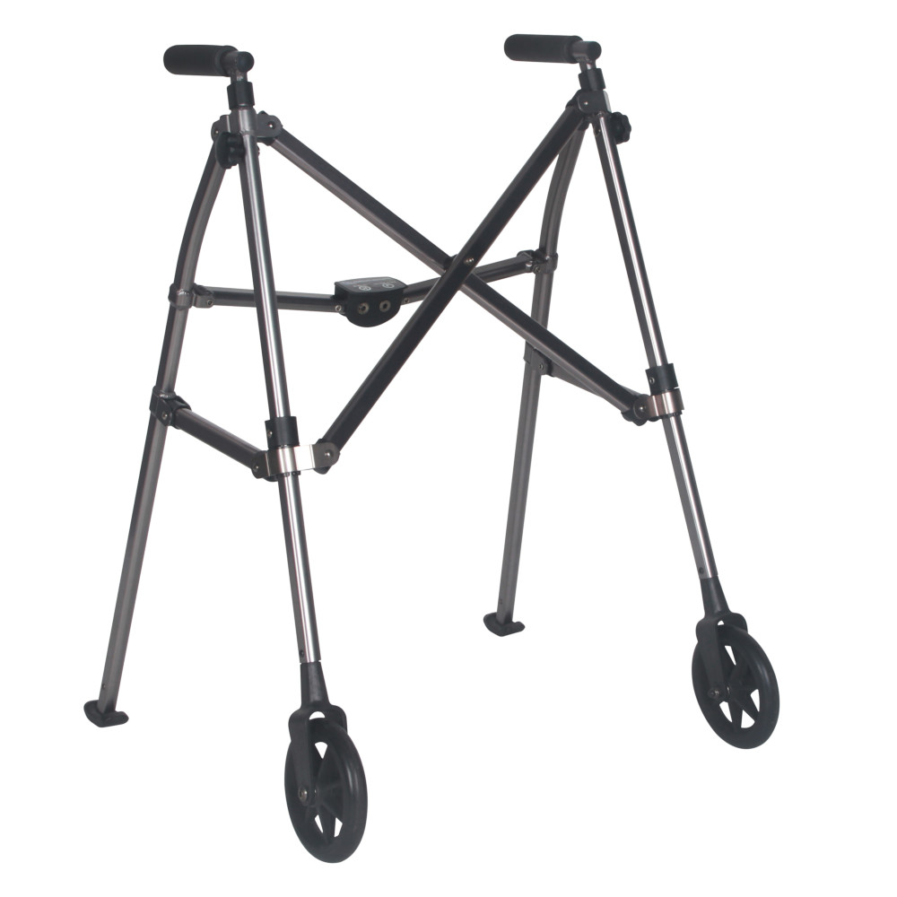 Este andador plegable compacto con ruedas ofrece mucha estabilidad al caminar. Deben utilizarse ambos brazos para usarlo. Las ruedas facilitan la marcha, al no necesitar levantar el andador, y ayudan a que éste se deslice.