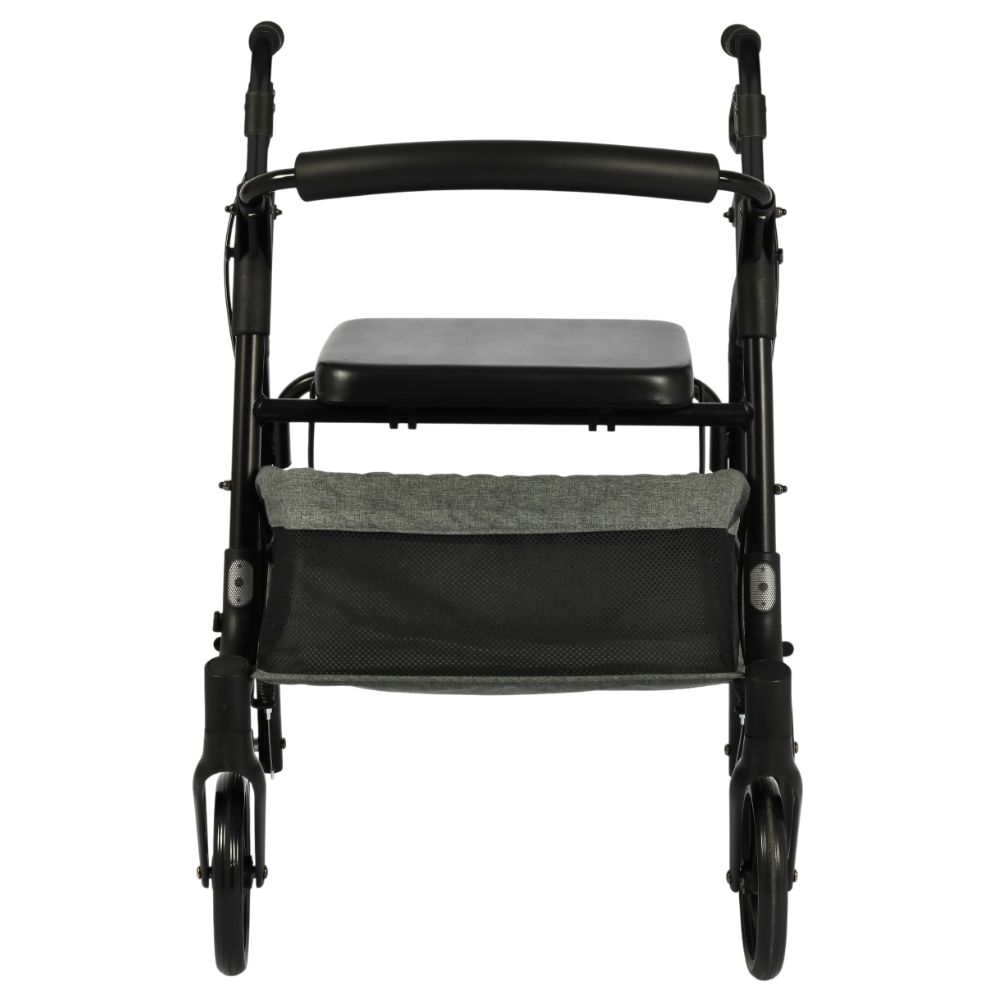 Este rollator con frenos y bloqueo disminuye el esfuerzo al caminar. No es necesario levantar el andador para poder avanzar gracias a sus ruedas. Las ruedas traseras se frenan y bloquean desde las empuñaduras mediante los frenos.