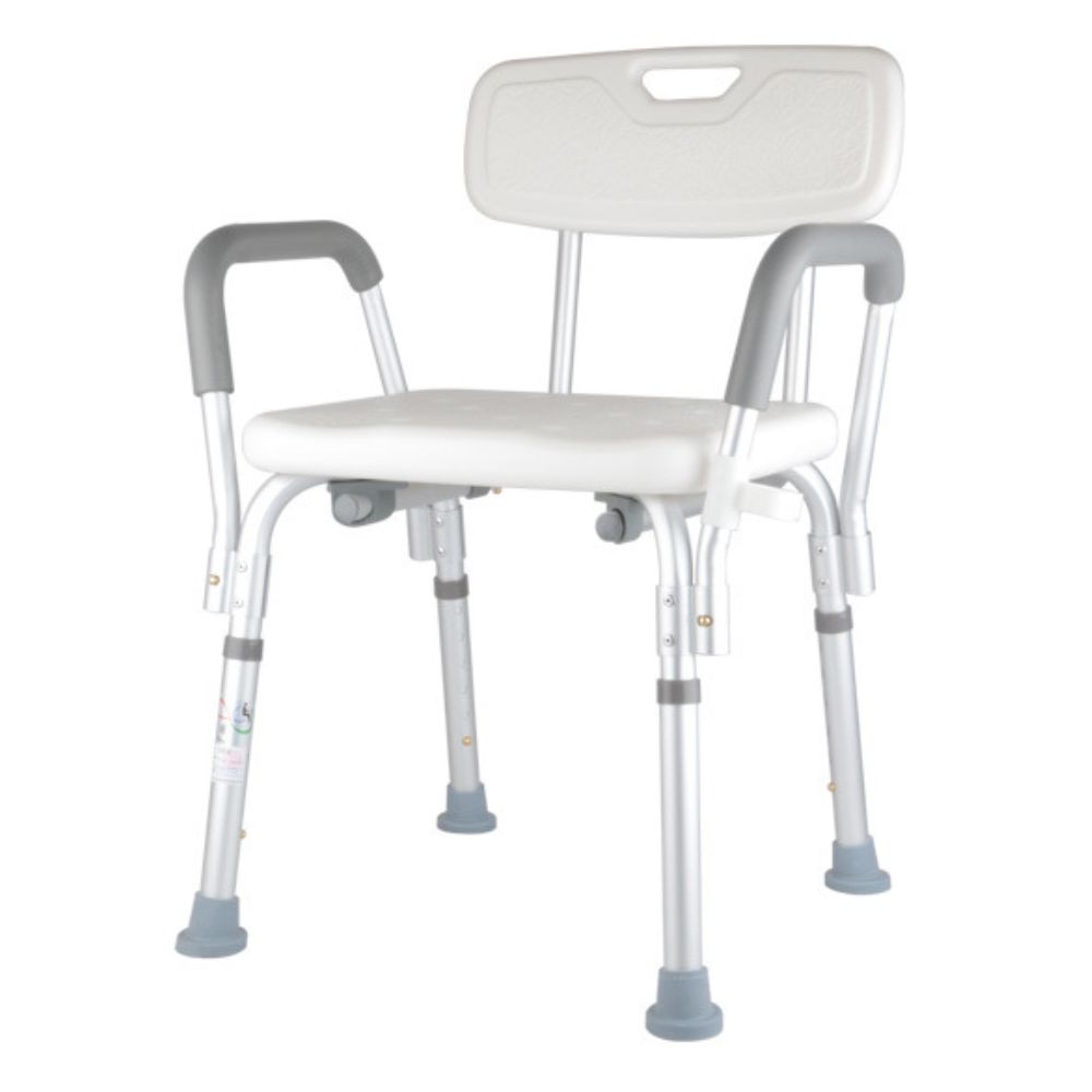Esta silla de baño con brazos y respaldo es un producto de apoyo para el aseo. Sus reposabrazos acolchados ayudan al agarre e incorporación.