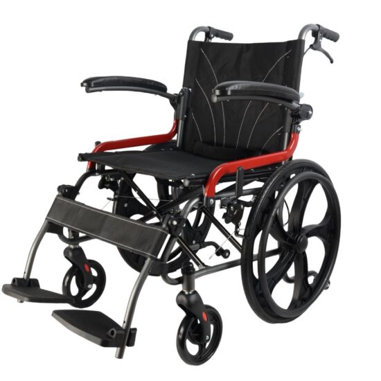 Esta silla de ruedas con frenos en las empuñaduras es muy práctica. El tamaño de sus ruedas permite que pueda utilizarse tanto en el interior como en el exterior. El usuario puede sentarse en ella para que lo trasladen utilizando las empuñaduras.