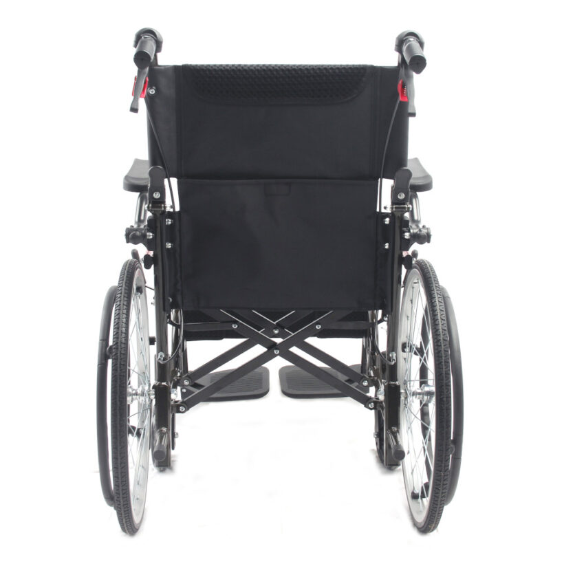 - Silla plegable con empuñaduras para transporte y frenos.