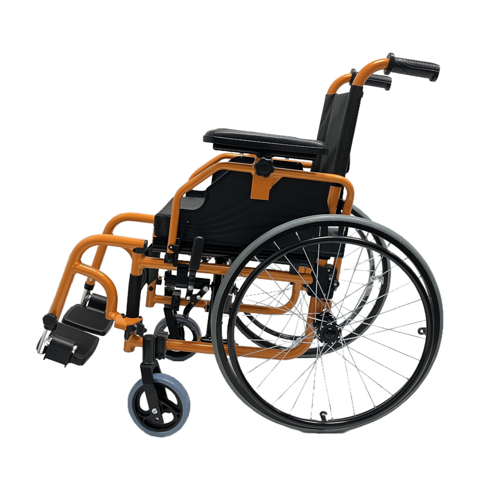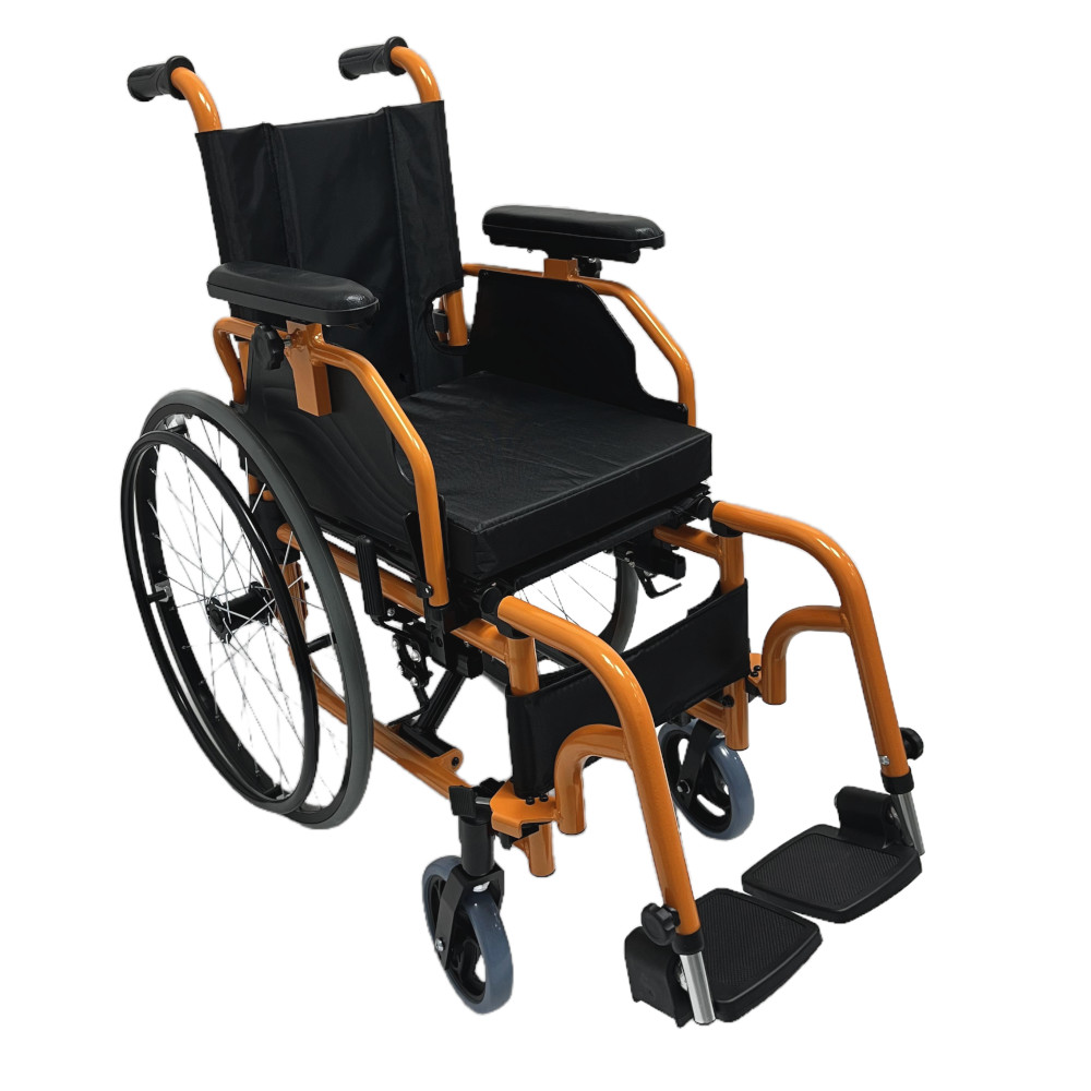 Esta silla de ruedas infantil de aluminio autopropulsable es muy completa. Puede utilizarse tanto en el interior como en el exterior. El usuario puede sentarse en ella para que lo trasladen utilizando las empuñaduras o puede desplazarse por sí mismo utilizando los aros de las ruedas traseras.