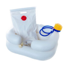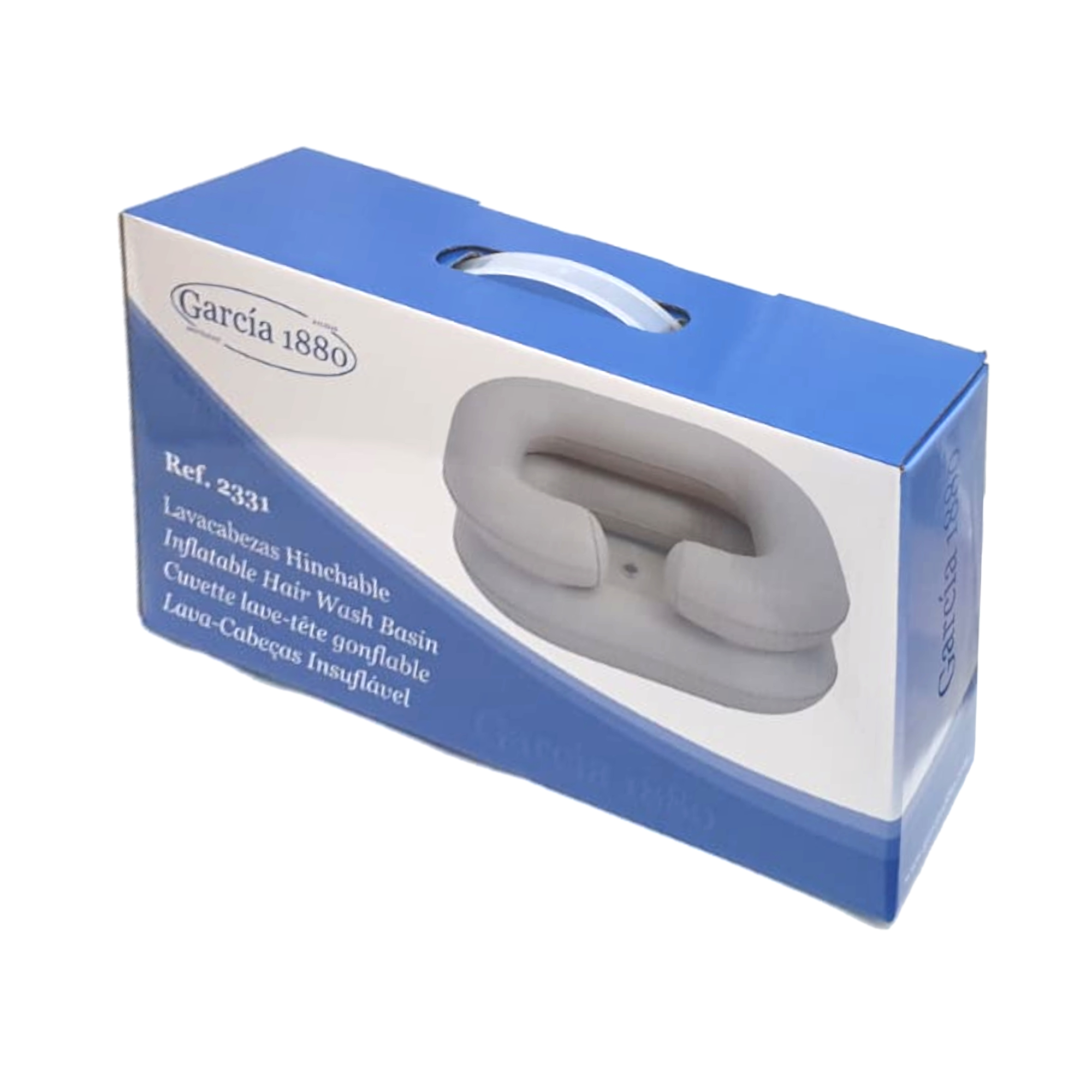 Este lavacabezas permite una buena posición de hombros y cabeza. Se hincha fácilmente y se coloca bajo la cabeza del paciente. Se necesita la ayuda de otra persona. Lleva un tubo de drenaje para evacuar el agua.