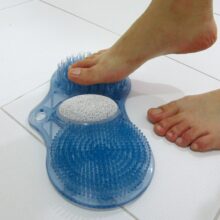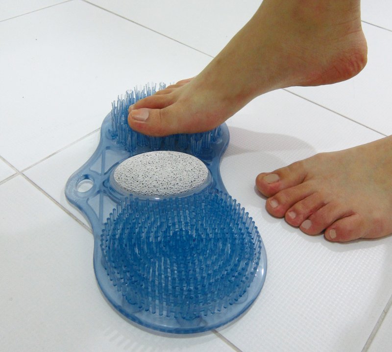 Producto fabricado en PVC de uso muy sencillo. Dispone de unas pequeñas ventosas que hacen que quede fijado en el suelo, pudiendo frotar los pies sobre sus tres diferentas tipos de cepillos, sin necesidad de agacharse, evitando riesgos de caída o desequilibrio cuando realiza su higiene personal.