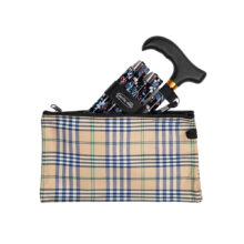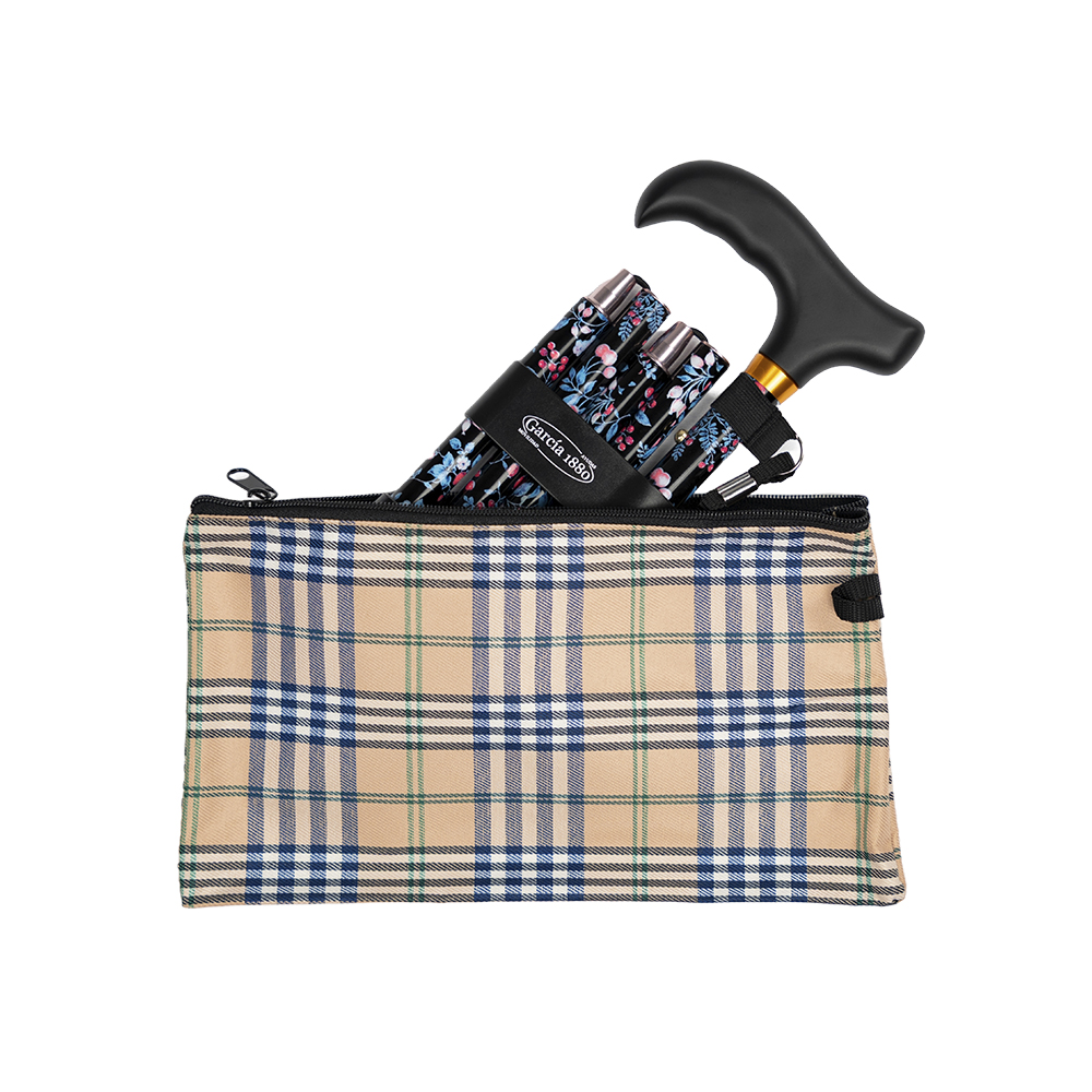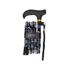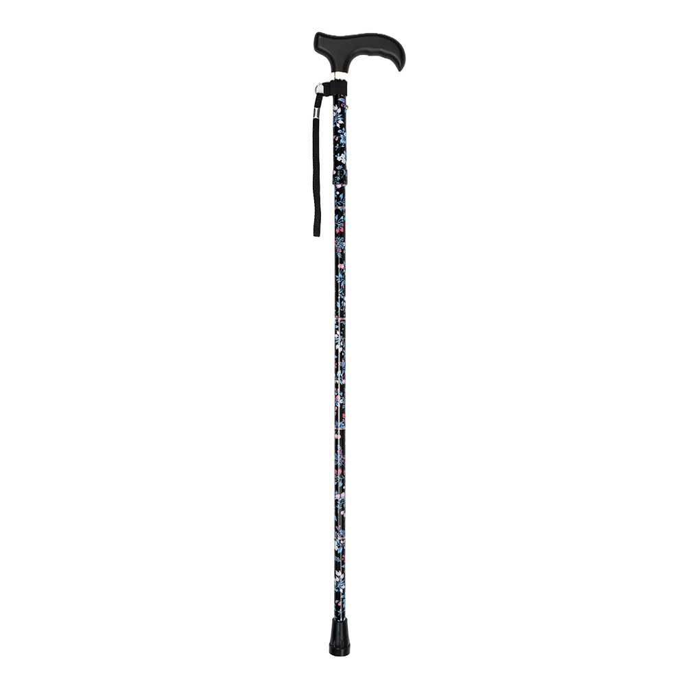 Esta muletilla mini plegable está fabricada en aluminio. Estampada con flores, fondo negro. Sus características principales son las siguientes: