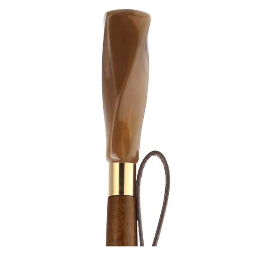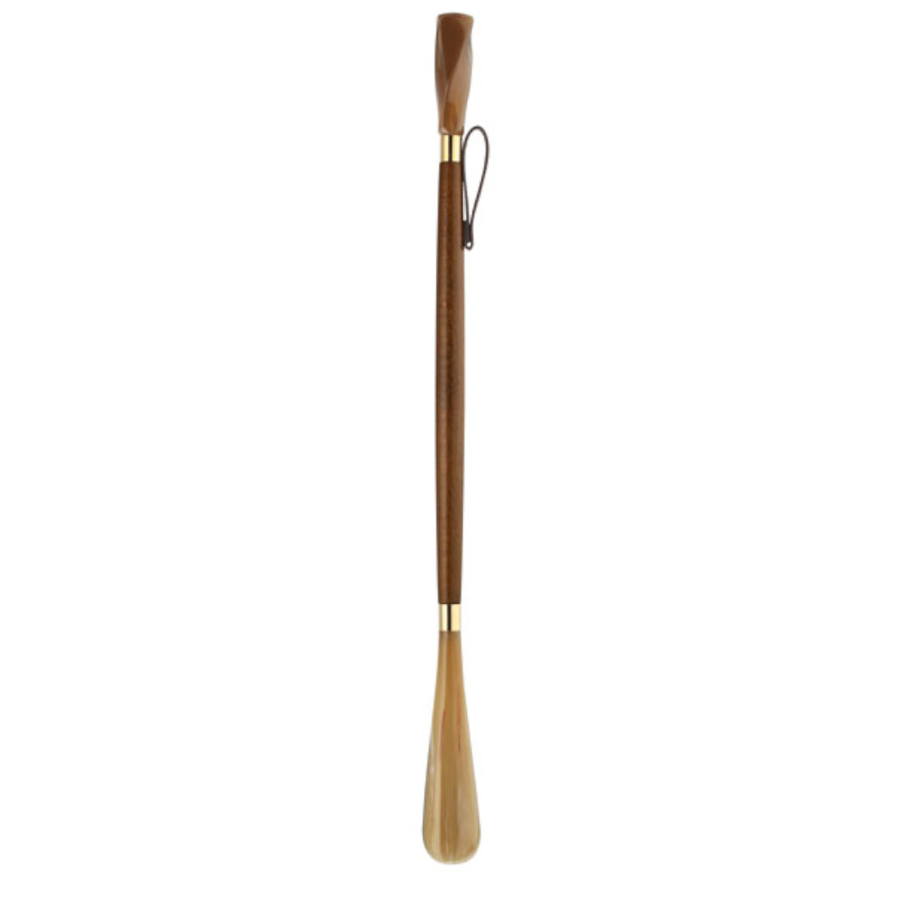 Este calzador está fabricado en madera de haya barnizada. El puño curvado y la pala están fabricados en acetato de celulosa efecto cuerno. Anillas de latón en las uniones.