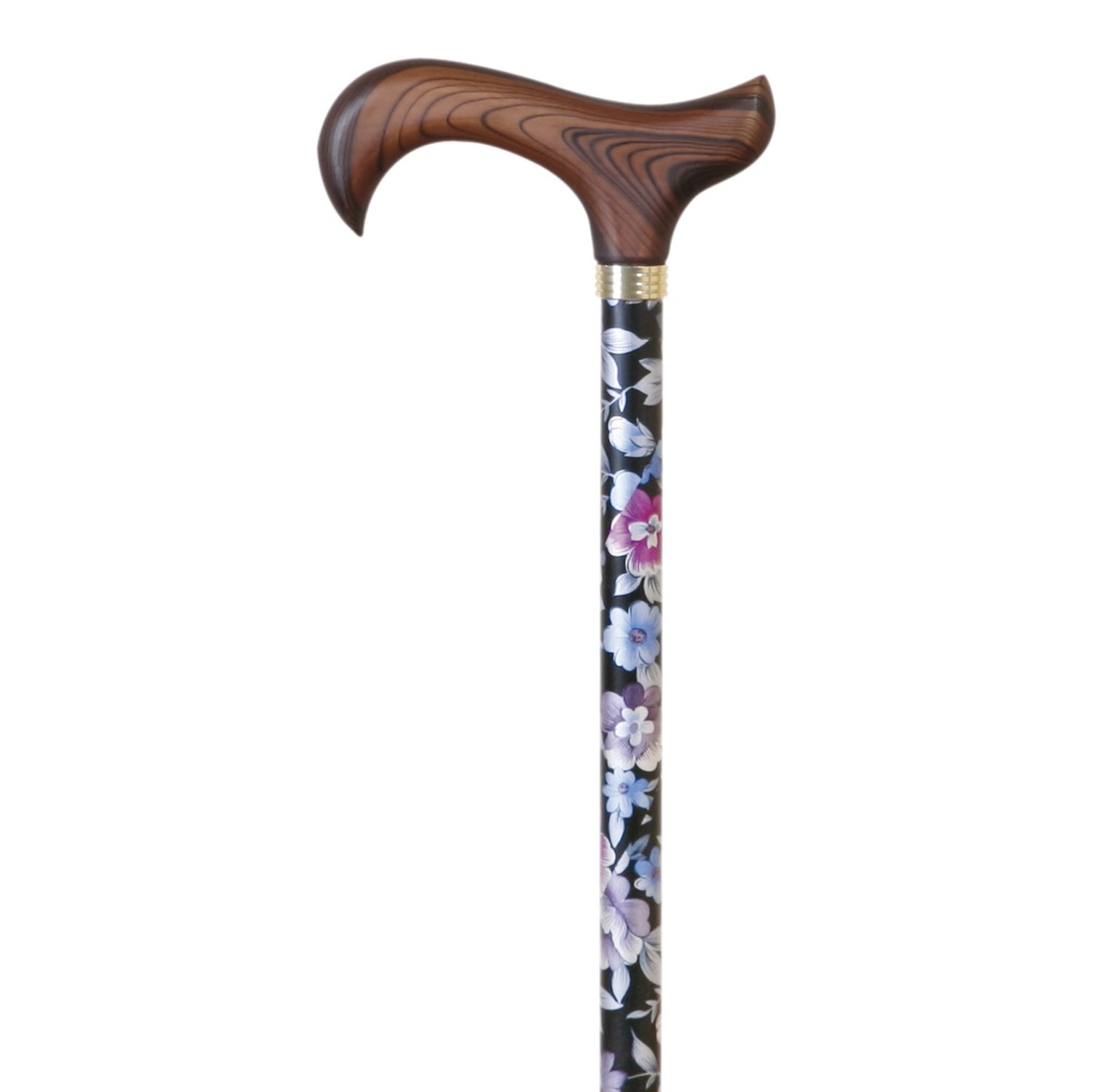 Esta muletilla extensible está fabricada en aluminio. El tubo es de color negro con estampado de flores en varios colores y la empuñadura es de madera. Sus características principales son las siguientes:
