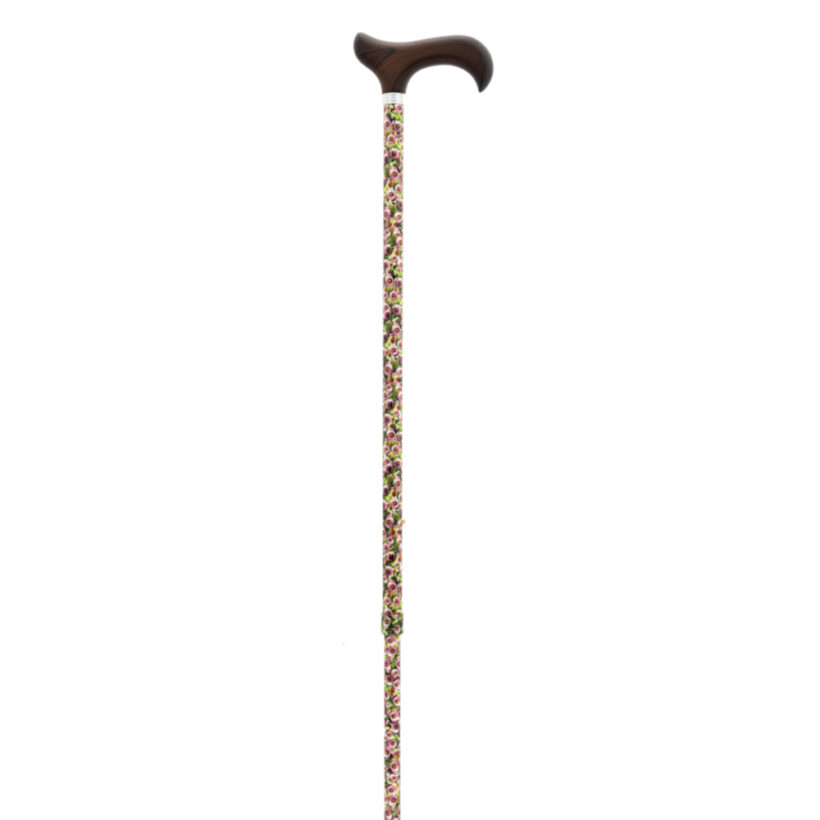 Muletilla extensible de aluminio con estampado de flores pequeñas de varios colores y empuñadura de madera.
