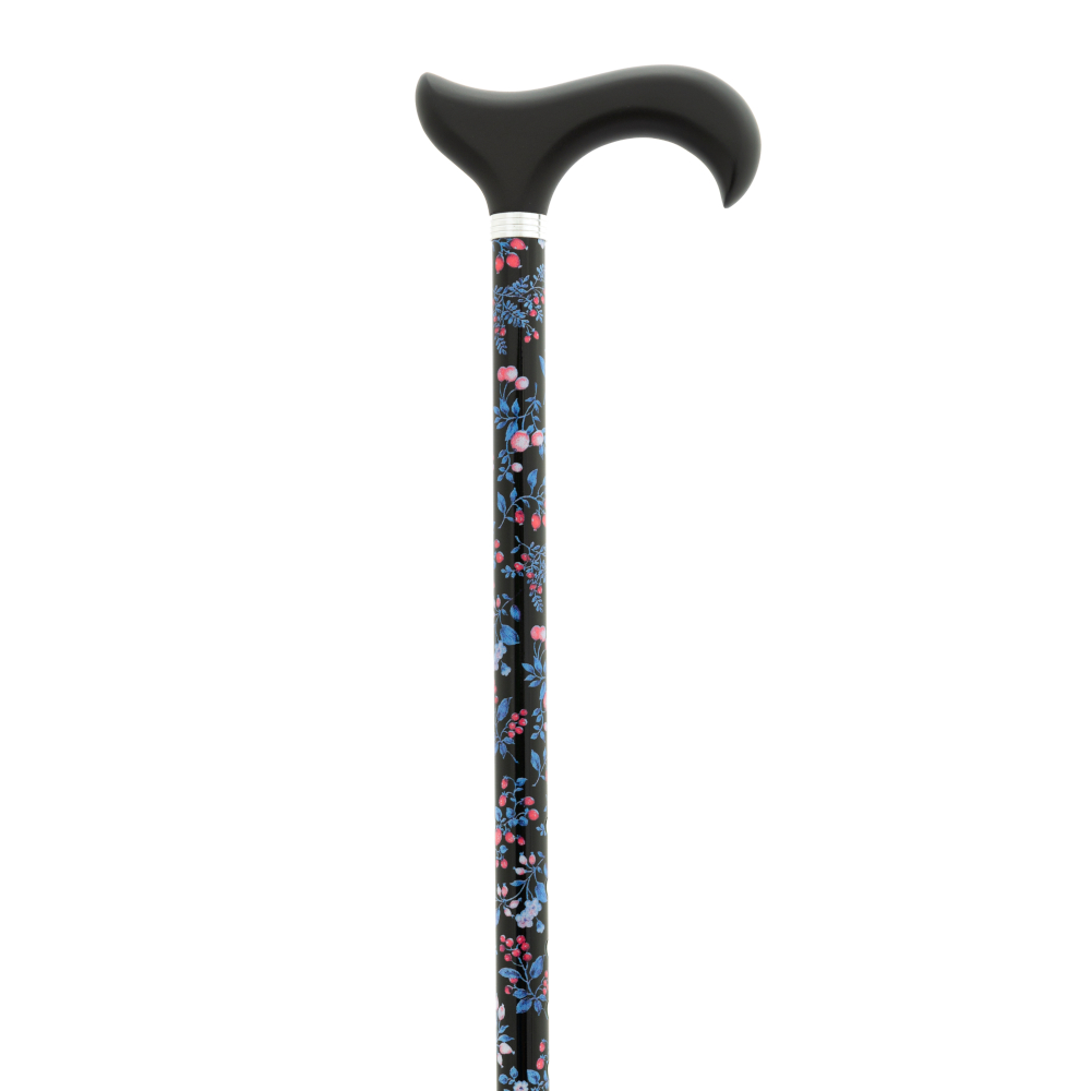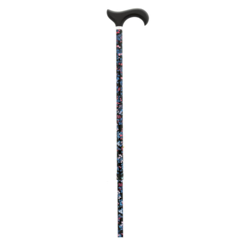 Muletilla extensible de aluminio. El tubo tiene un fondo oscuro con estampado de flores pequeñas en varios colores. La empuñadura es de madera, de color negro.