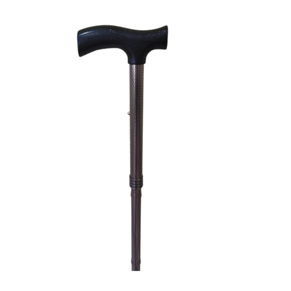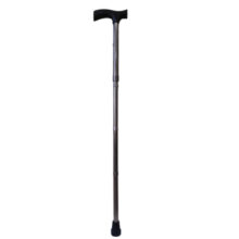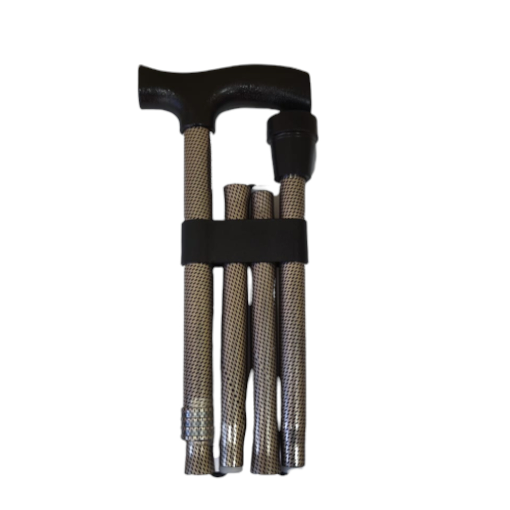 Esta muletilla plegable está fabricada en aluminio. El tubo es estampado en bronce y su empuñadura es de plástico en color negro.