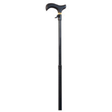 Esta muletilla extensible está fabricada en aluminio. El tubo es de color negro, y un estampado muy pequeño y discreto de rayas en color verde dispone de un botón o gatillo para poder regularla a la altura necesaria.